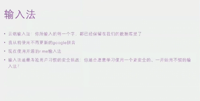 我举个简单的例子。我之前做过一些类似的普及型讲座,有时是针对特定群体的。当我谈到某个话题时,就进行不下去了。比如我谈到输入法时,很多人就说他们没办法更换输入法。如果无法更换输入法,(待会谈输入法的时候,我会谈论这个问题)其实也就意味着即使你采取了其他安全措施、加密或使用安全邮件都没有用,因为输入法会成为你整个安全体系的短板。