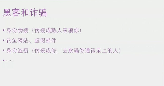 我们再谈谈黑客和诈骗的问题。我准备这个 PPT 的时候,今天还跟我太太聊,她说她也需要听听我讲网络安全的问题。我就告诉她我大概要讲的内容。她说:“对,我就是你要针对的那些人。”就是她觉得自己心里没有做错任何事,所以不怕任何监控或监视,因为她心里没有害人之心,不做坏事,所以可以随意使用计算机,不怕政府查,也不怕公司监控。但问题就在这里,当你不注意自己的安全的时候,你很可能会影响到朋友和亲人的安全。因为你的信息隐私暴露得越多,用户画像就越准确,黑客就越可能伪装成你的熟人来骗你。